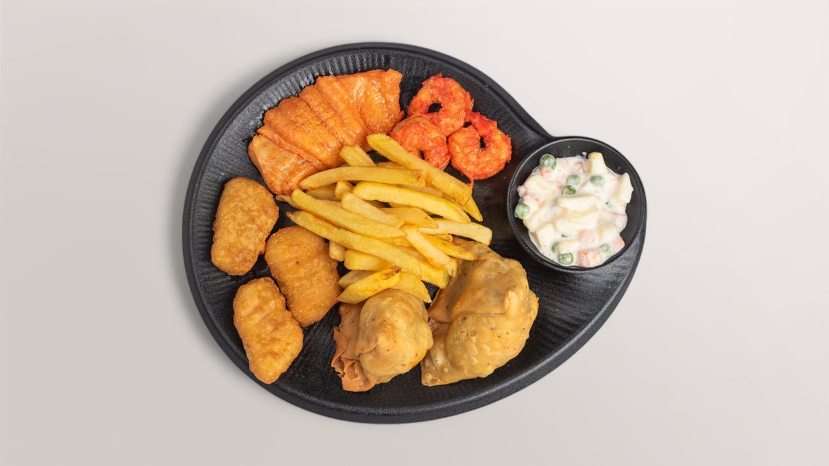mit Pommes frites, gebratenen Garnelen, Karachi gebratenem Fisch, Chicken Nuggets und Samosa