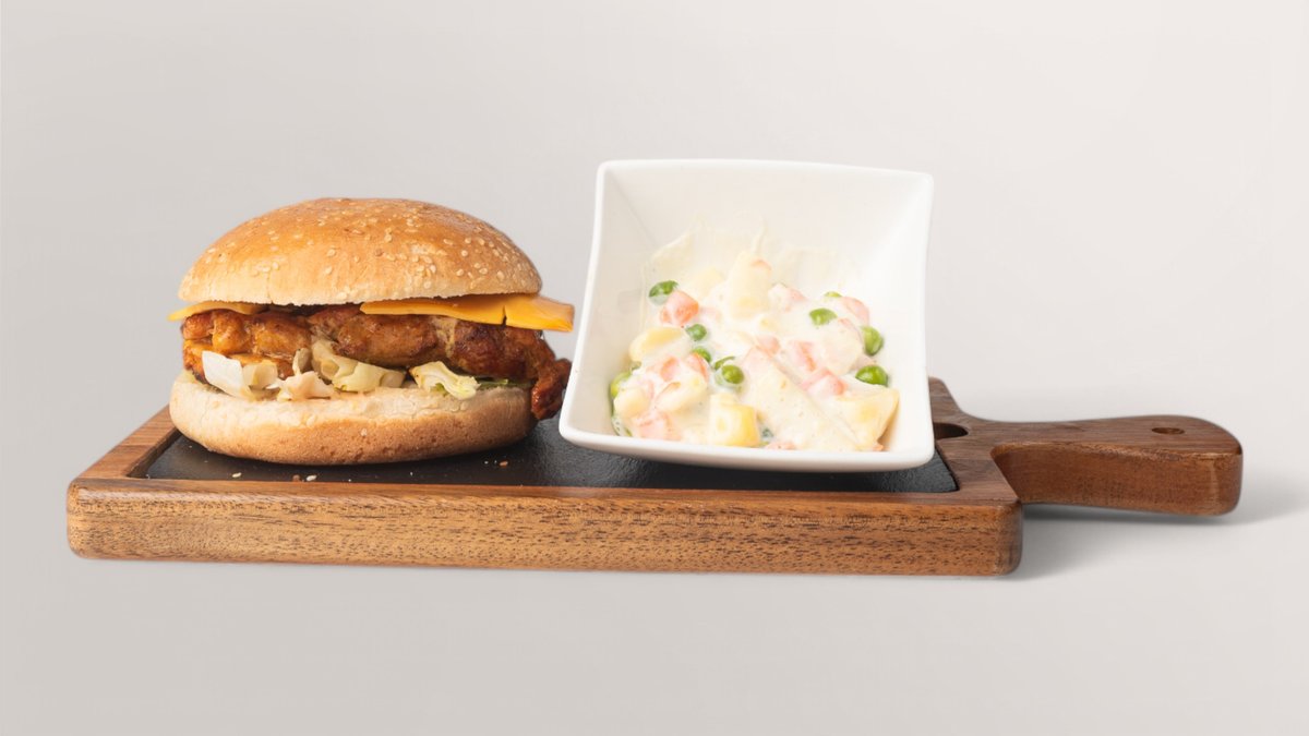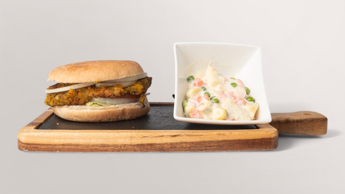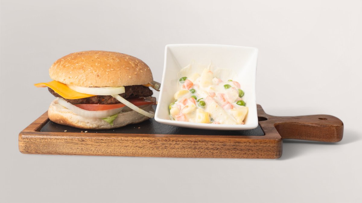 alle Gerichte werden mit Käse zubereitet und mit russischem Salat serviert („105. Veggie Burger” wird ohne Käse zubereitet)