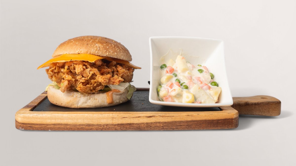 mit mariniertem, paniertem und frittiertem Hähnchenfilet und Thousand Island Soße