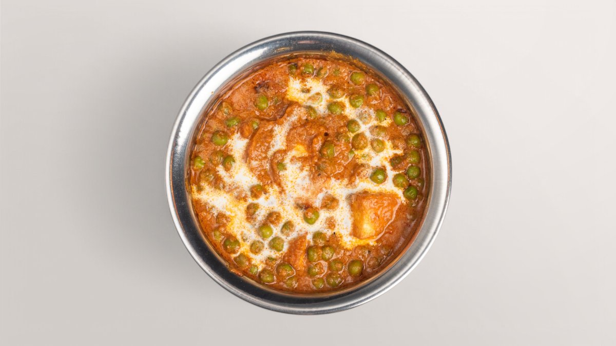 mit gedämpften grünen Erbsen, Gewürzen und Sahne, serviert mit Hüttenkäse