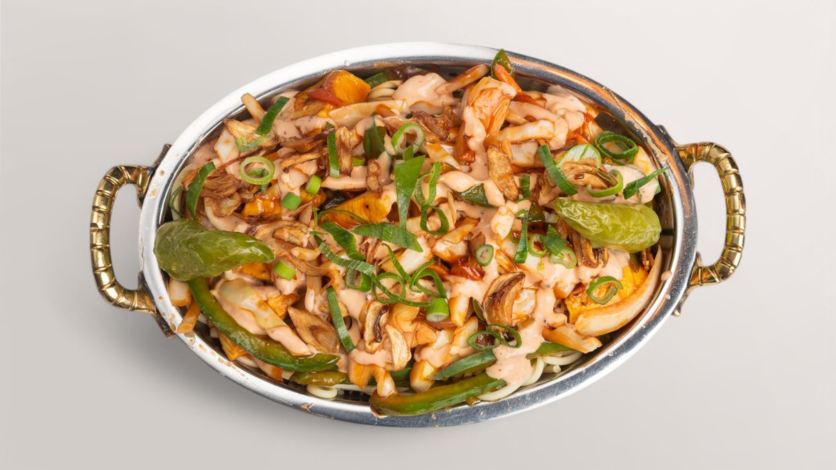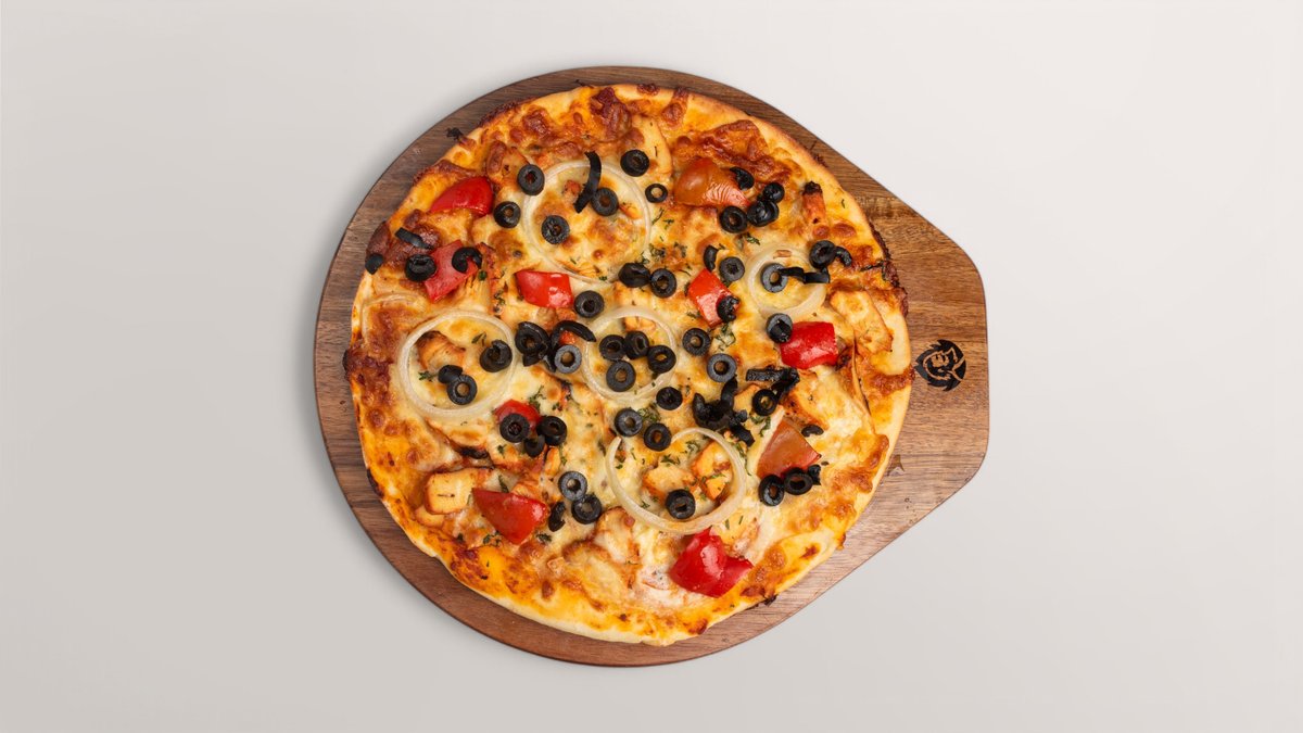 mit Chicken Malai Boti, Zwiebeln, Oliven und Paprika