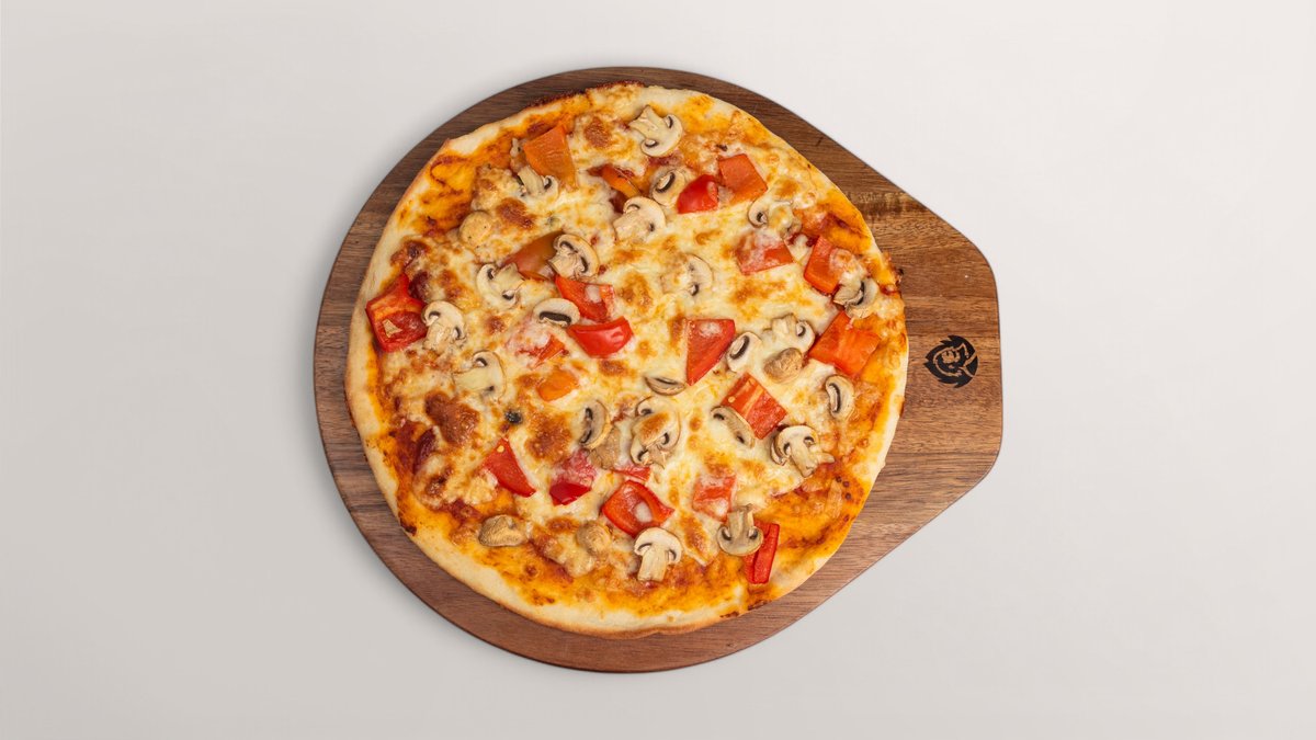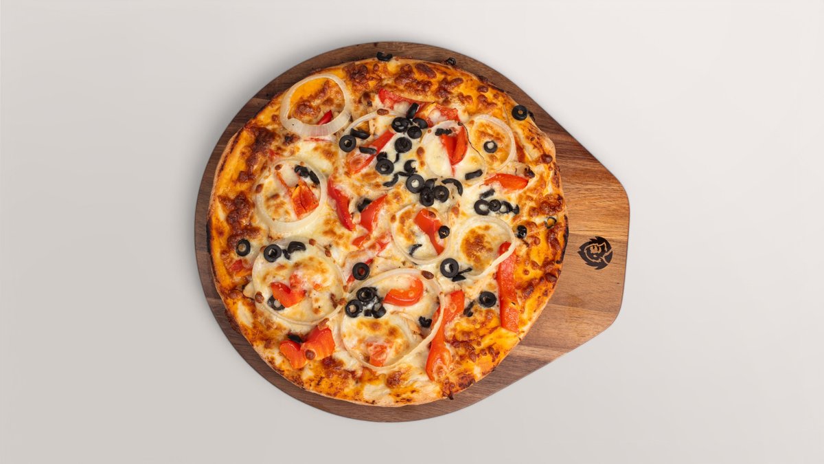 mit Champignons, Paprika, Oliven und Zwiebeln
