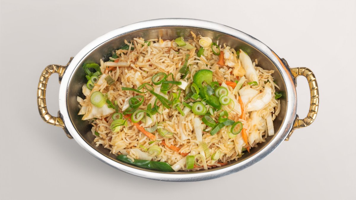 spezieller gebratener Zwiebelreis mit Hähnchen und Nudeln in Mayonnaise-Soße
