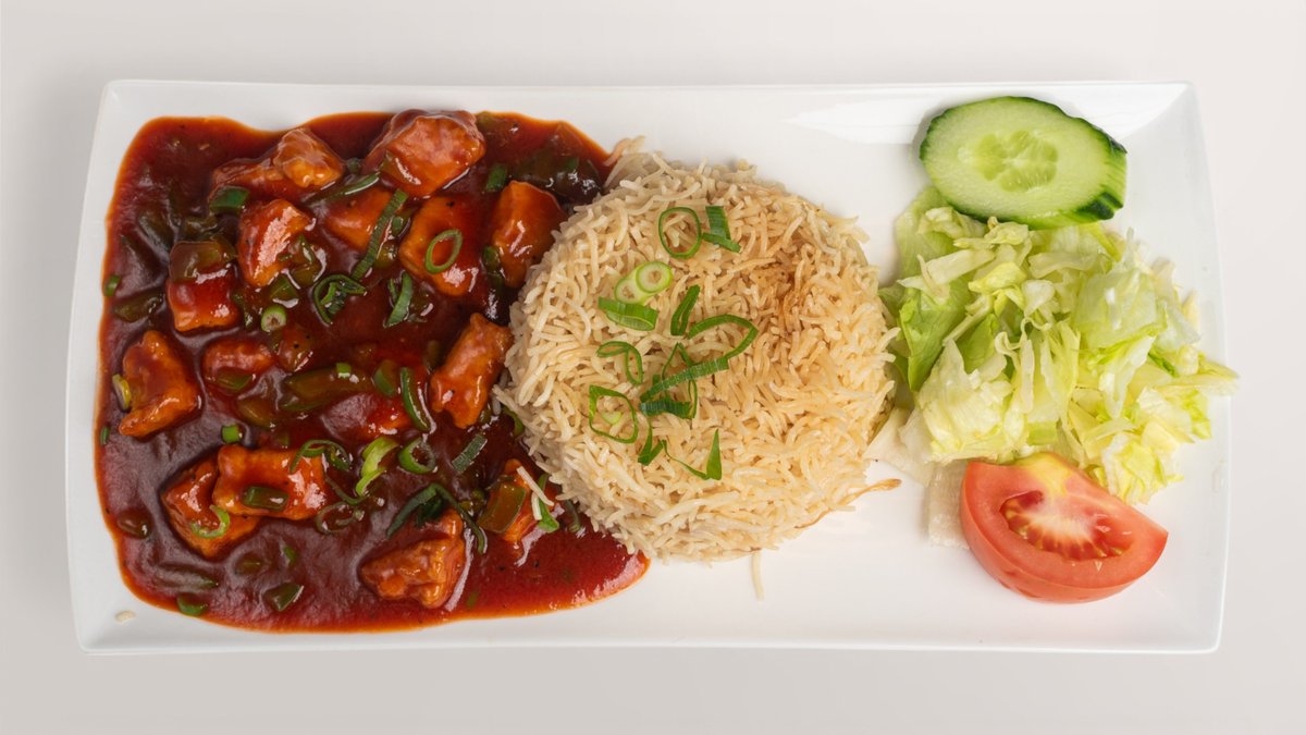 mariniert, frittiert Hähnchenwürfel in Tomatensoße gekocht, serviert mit Reis