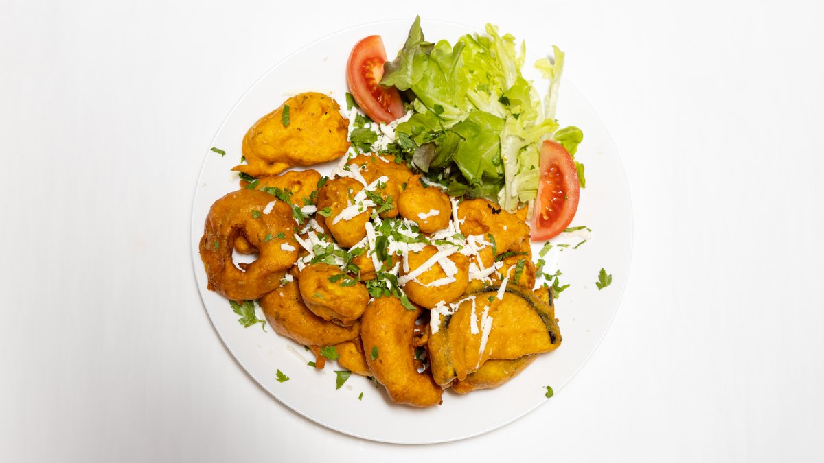 alle Gerichte werden in Kichererbsenmehl frittiert und mit 2 hausgemachten Dips serviert