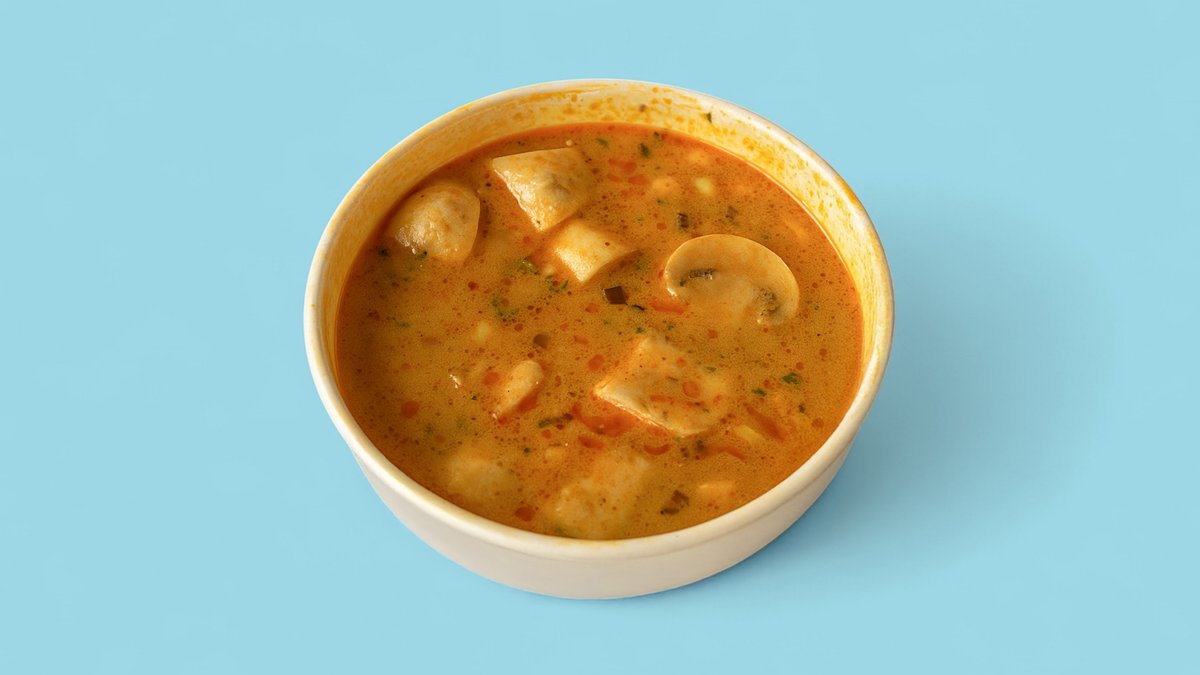 scharf mit hausgemachtem südvietnamesischen Curry, Kokosmilch, Hähnchenfleisch, Champignons, Lauchzwiebeln und Koriander