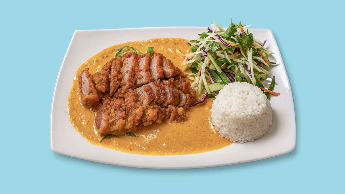 mit Kokosmilch, Erdnusssoße, Gemüse, einer Zutat und einem Schärfegrad deiner Wahl