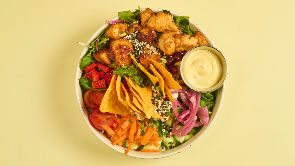 feurig und würzig mit Hähnchen, Jalapeños, Tortilla-Crunch, Tomaten, Gurken, Guacamole, Kidneybohnen, Sour Cream, Röstzwiebeln, Mais und Honig-Senf-Soße