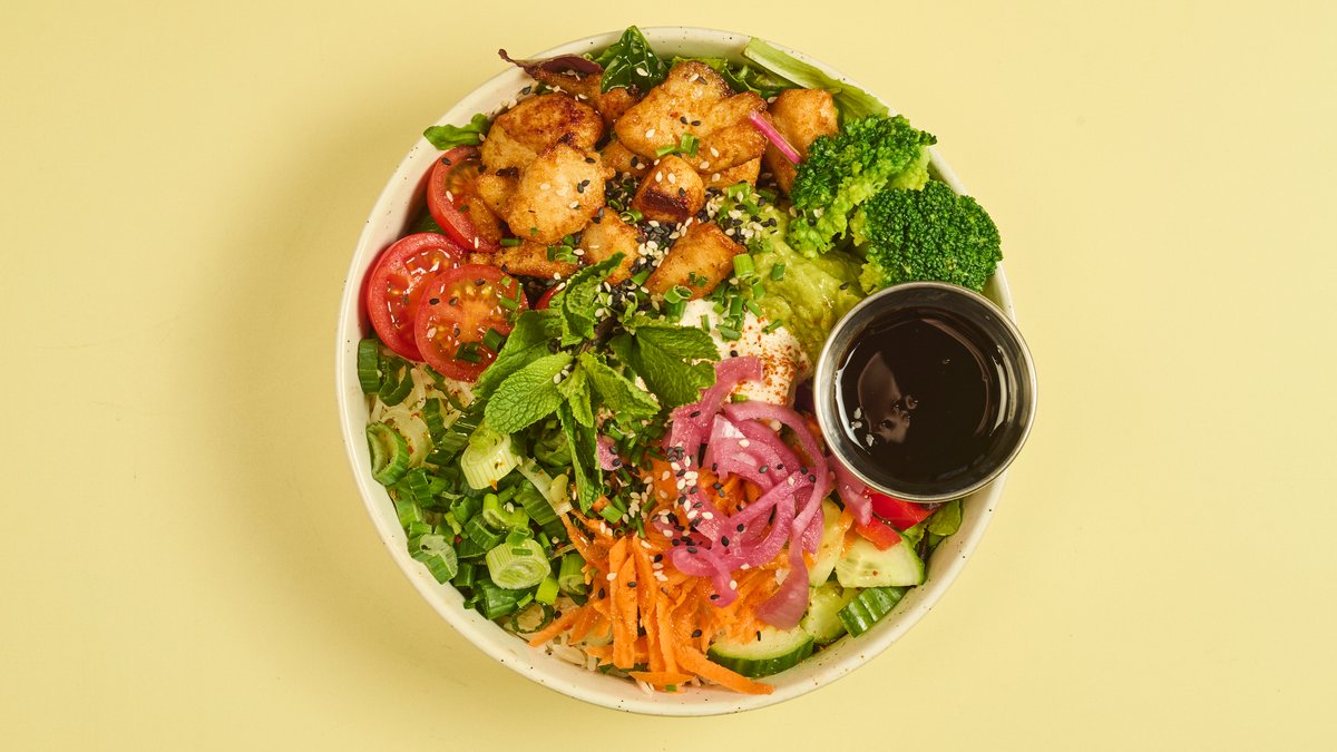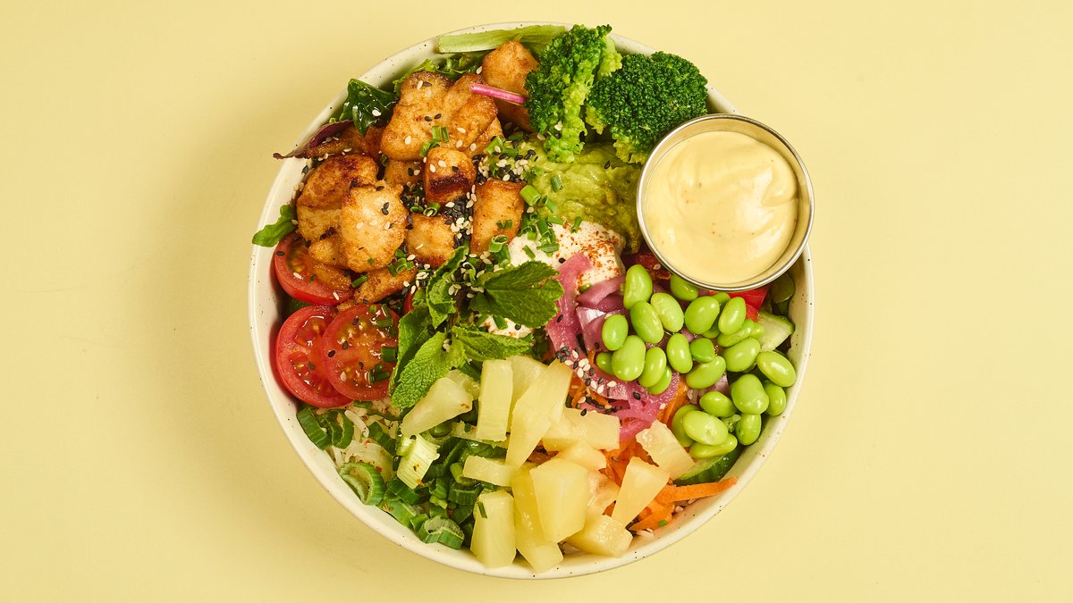 saftiges Hähnchen mit knackigem Gemüse, Teriyaki-Soße, Tomaten, Gurken, Lauchzwiebeln, Edamame, Guacamole, Sour Cream, Mais, Karotten, Brokkoli und Sesam