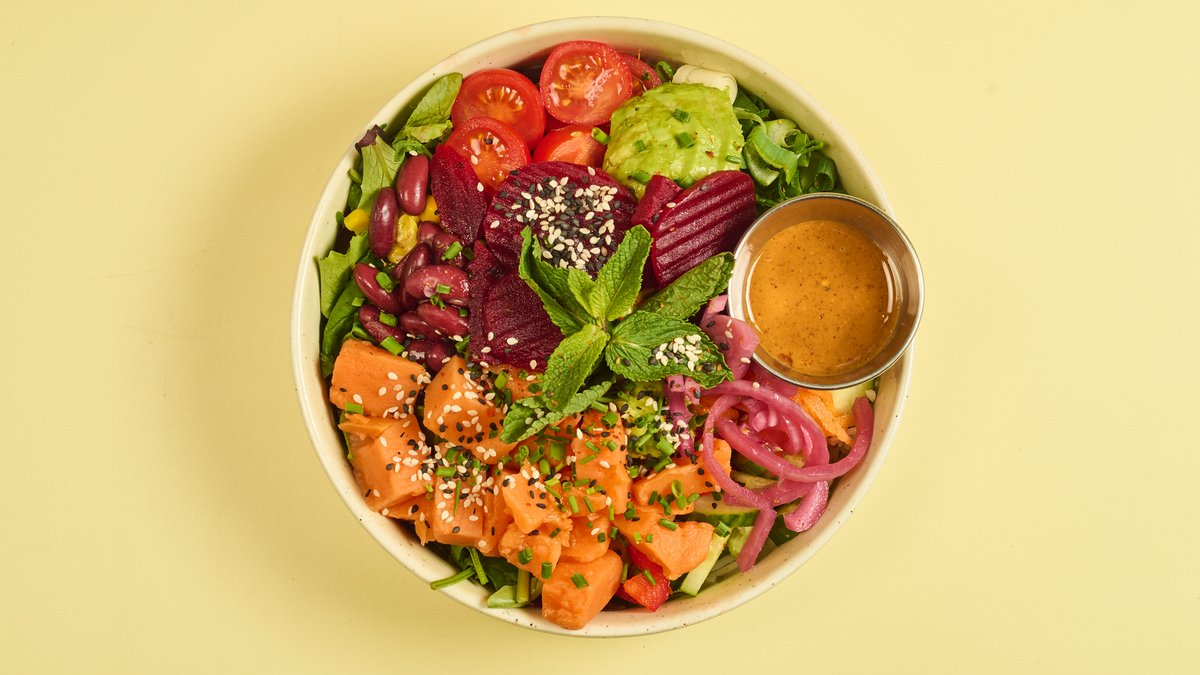 alle Bowls werden mit Poke Bull Salat, eingelegten Zwiebeln, Reis, Paprika und einer Soße deiner Wahl zubereitet