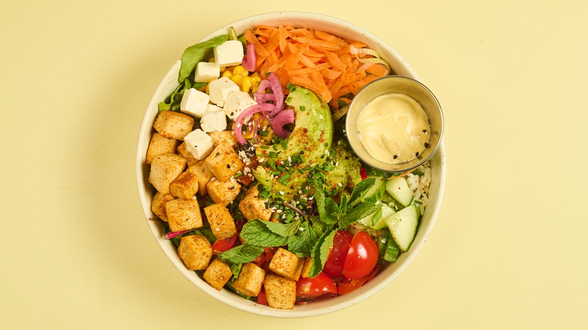 bunter Genuss mit Tofu, Feta, knackigem Gemüse, gebackenem Tofu, Guacamole, Avocado, Tomaten, Gurken, Kichererbsen, Schnittlauch und Sesamsoße