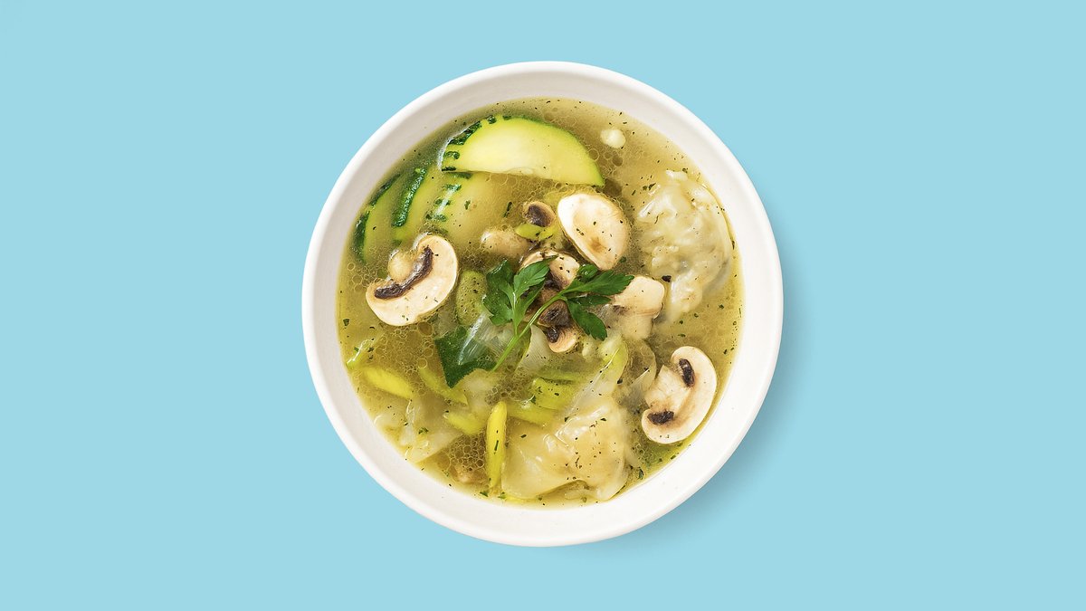 traditionelle Kräuterbrühe mit Pak Choi, Zucchini, Pilzen und hausgemachten Van-Than-Teigtaschen gefüllt mit Lotuswurzeln, Morcheln, Tofu und Zwiebeln
