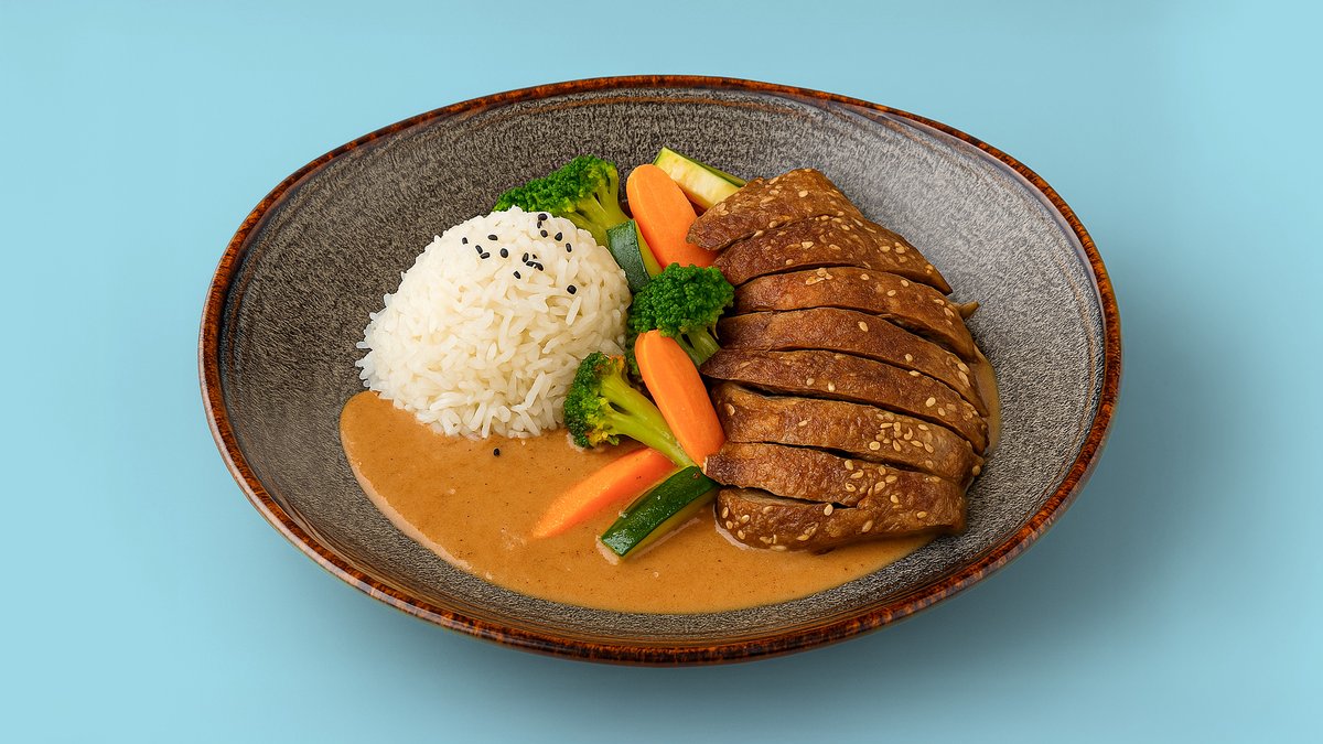 knusprig gebratene Seitan-Ente mit frischem saisonalem Gemüse und Reis, serviert in einer Soße deiner Wahl