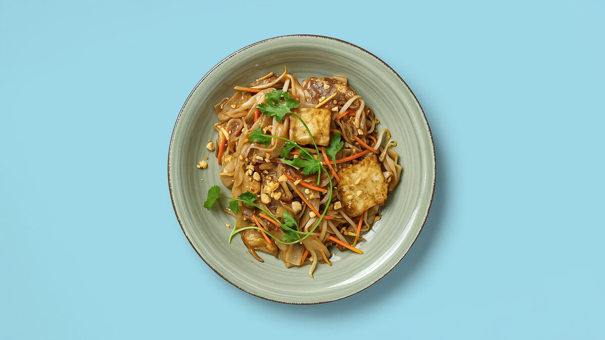 im Wok geschwenkte Reisbandnudeln mit süß-saurer Tamarindensoße, Karotten, Sojasprossen, gerösteten Erdnüssen, Limetten und einer Zutat deiner Wahl