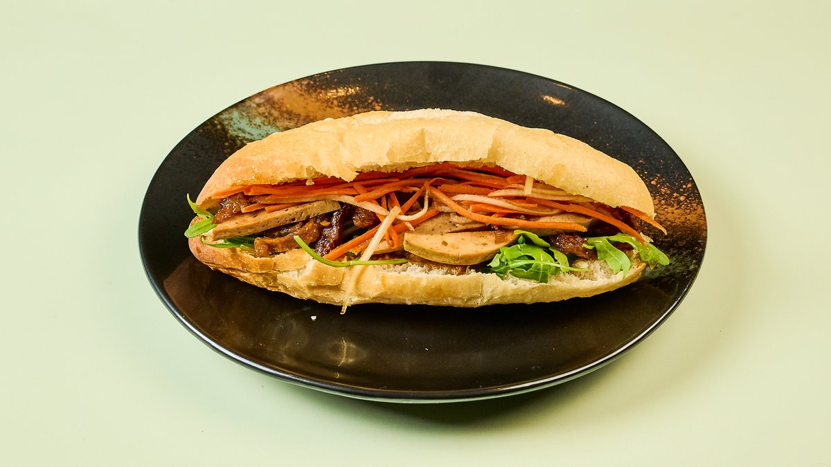vietnamesisches Baguette mit veganer Wurst aus Seitan, Zitronengras, eingelegten Karotten, Rettich und Koriander