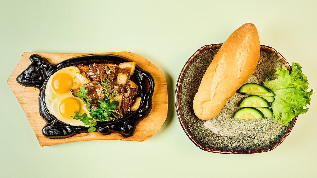 dünn geschnittenes Rindfleisch, in der Gusseisenpfanne gebraten, mit Kräuterseitlingen, Spiegelei, Zwiebeln, vietnamesischem Baguette und Koriander