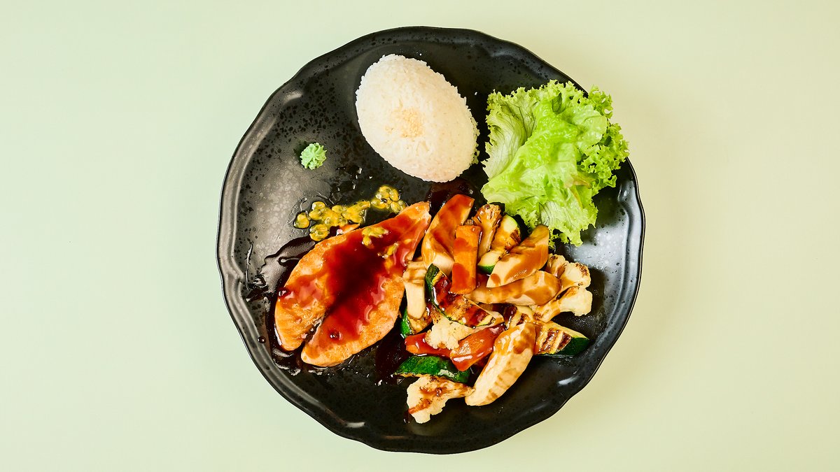 gebratenes Lachsfilet mit Kräuterseitlingen, Süßkartoffeln, Zucchini, Blumenkohl und Reis