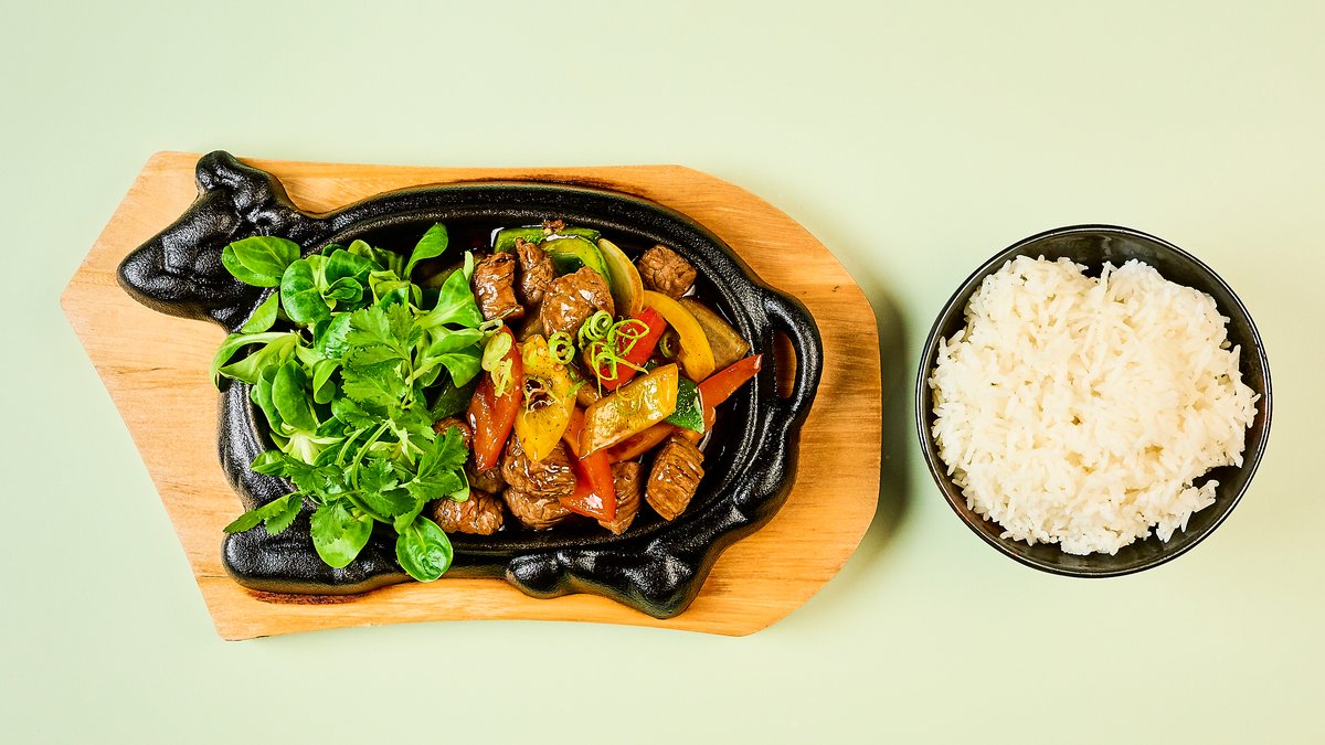 in der Gusseisenpfanne marinierte RindfleischwĂĽrfel, scharf angebraten mit Zwiebeln, Paprika, Koriander und Reis