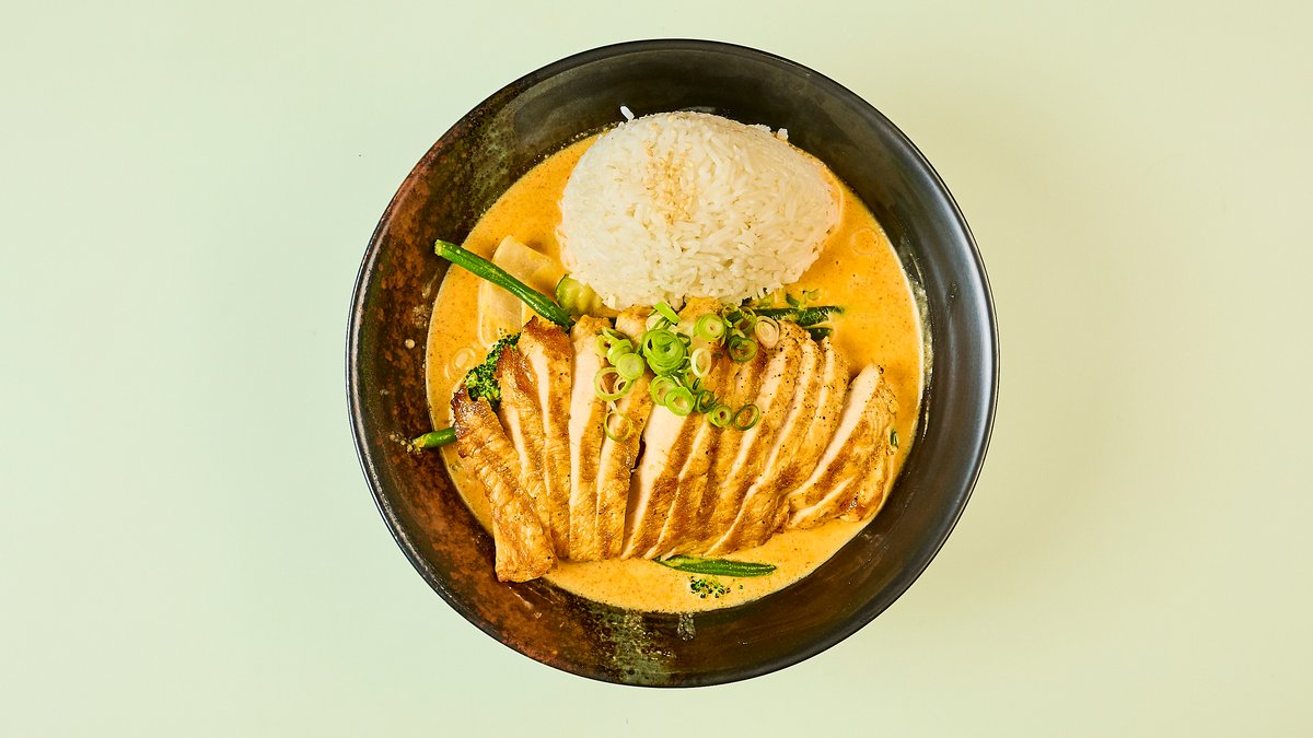 Nudelsuppe in Curry-Kokosmilch mit Hähnchenstreifen, Kräuterseitlingen, Pilze, Erdnüsse und Sesam-Reis-Chip