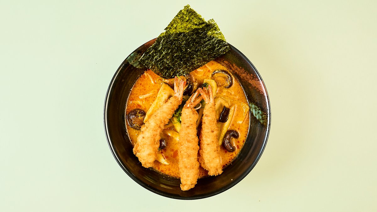 Ramen-Nudelsuppe in Kokosmilch mit panierten Riesengarnelen, Pak Choi, Pilzen und Koriander