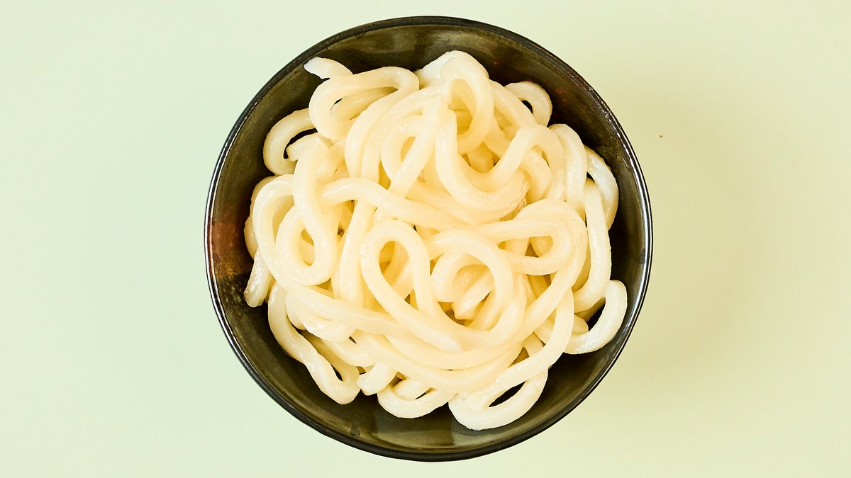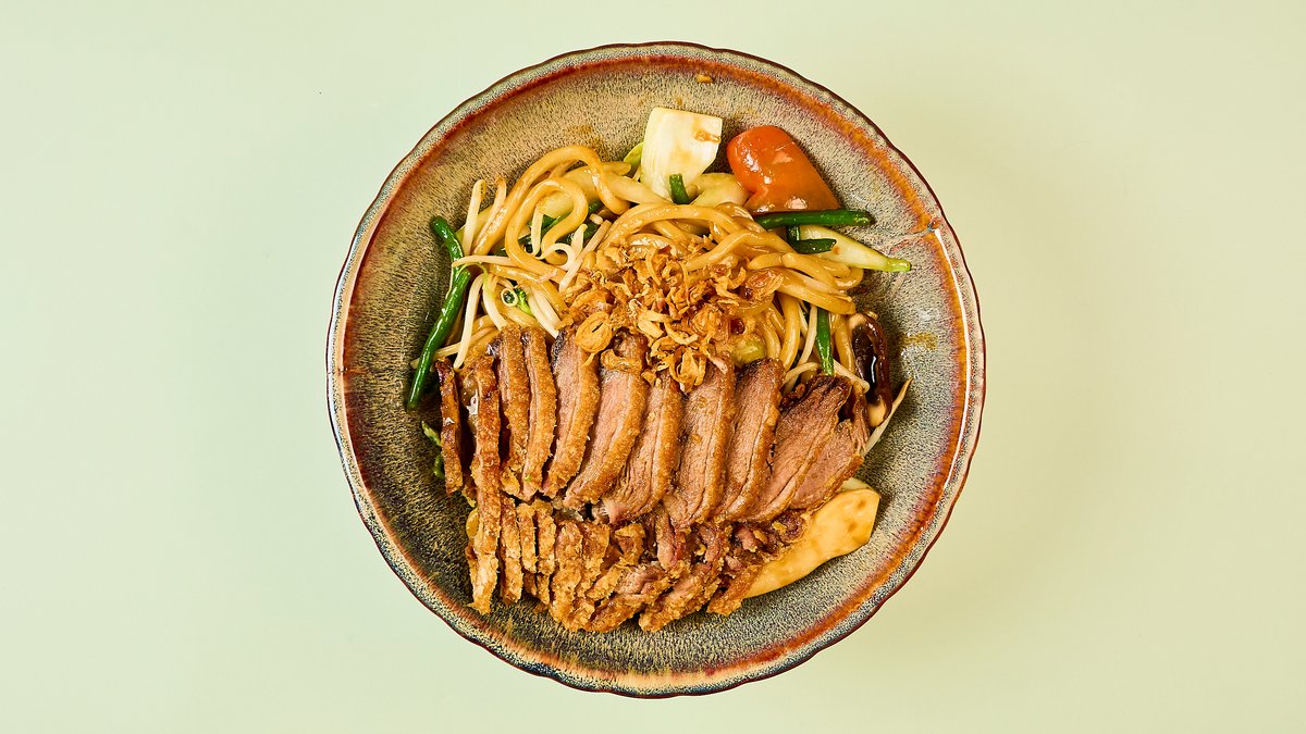 gebratene Udon-Nudeln mit knuspriger Ente, Kräuterseitlingen, Champignons, Pak Choi, Sellerie, Paprika, Brokkoli, Bohnen, Sojasprossen und Röstzwiebeln