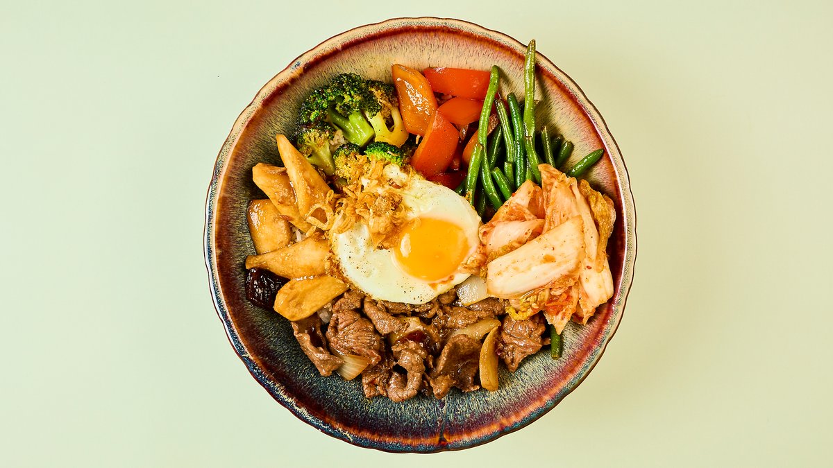 vietnamesisches Bibimbap mit Rindfleisch, Kräuterseitlingen, Kimchi, Brokkoli, Bohnen, Spiegelei und Reis