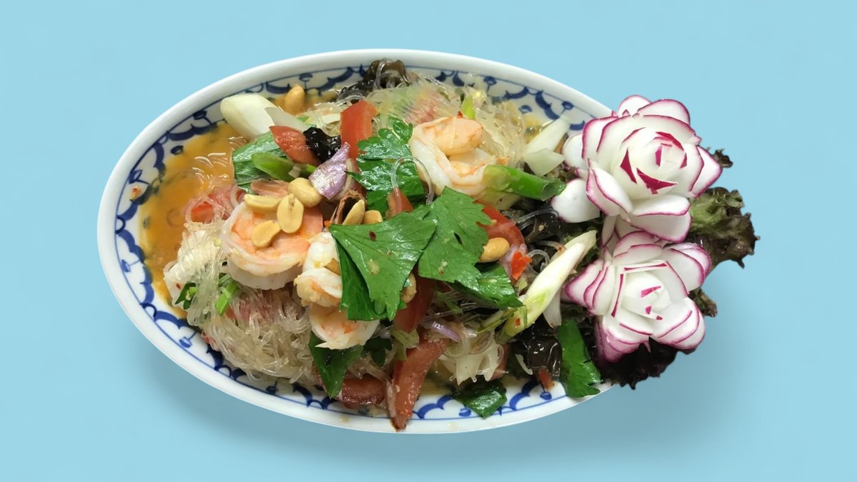 alle Salate werden mit Zwiebeln und frischen Thai-Kräutern zubereitet („Yam Nuea” wird ohne frischen Thai-Kräutern zubereitet)