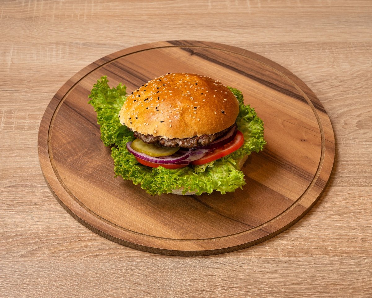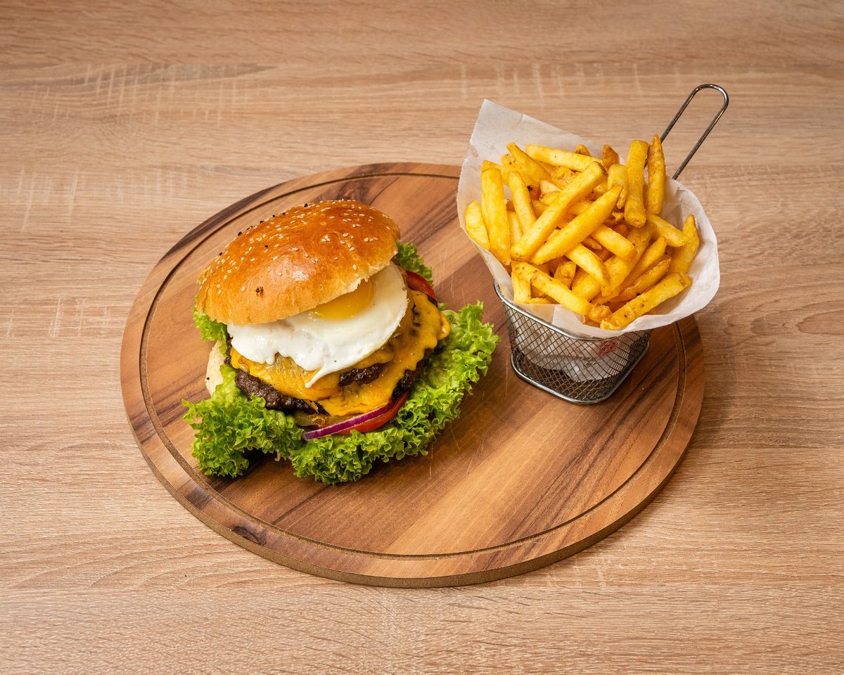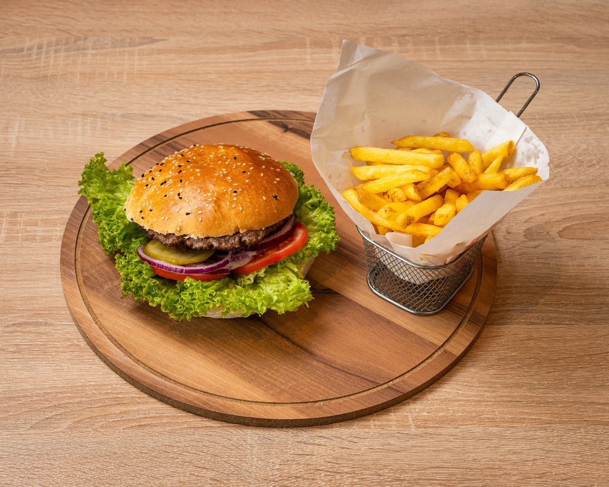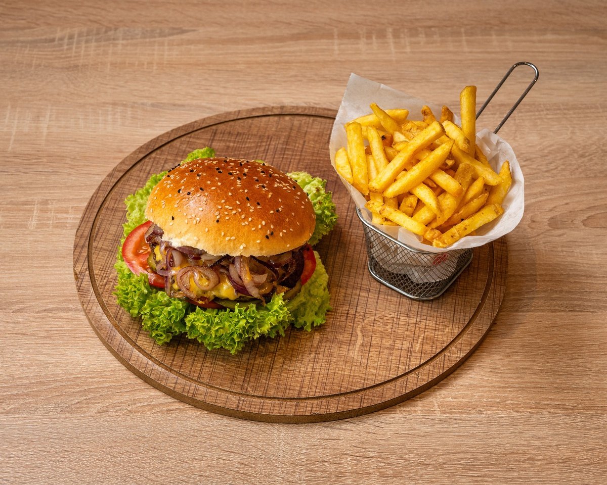 1x Hamburger 1x Pommes frites 1x alkoholfreies Getränk 0,33 l deiner Wahl