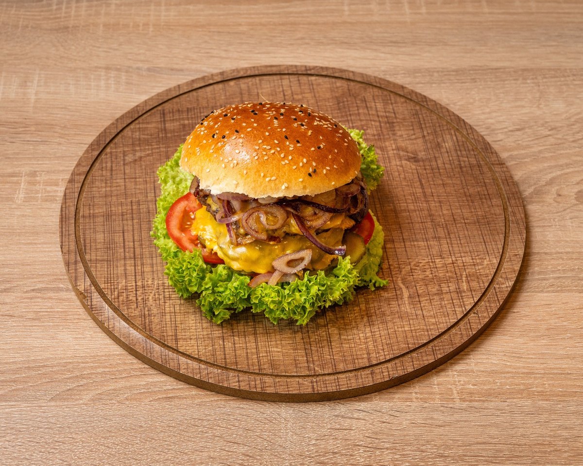 mit smashed Rindfleisch-Patty Käse und karamellisierten Zwiebeln