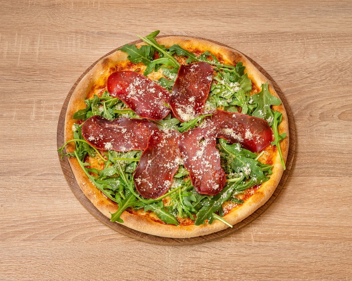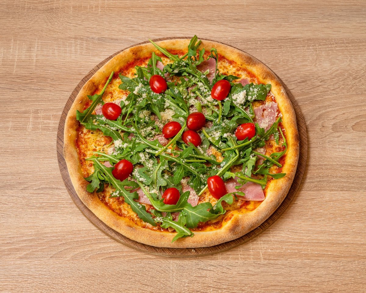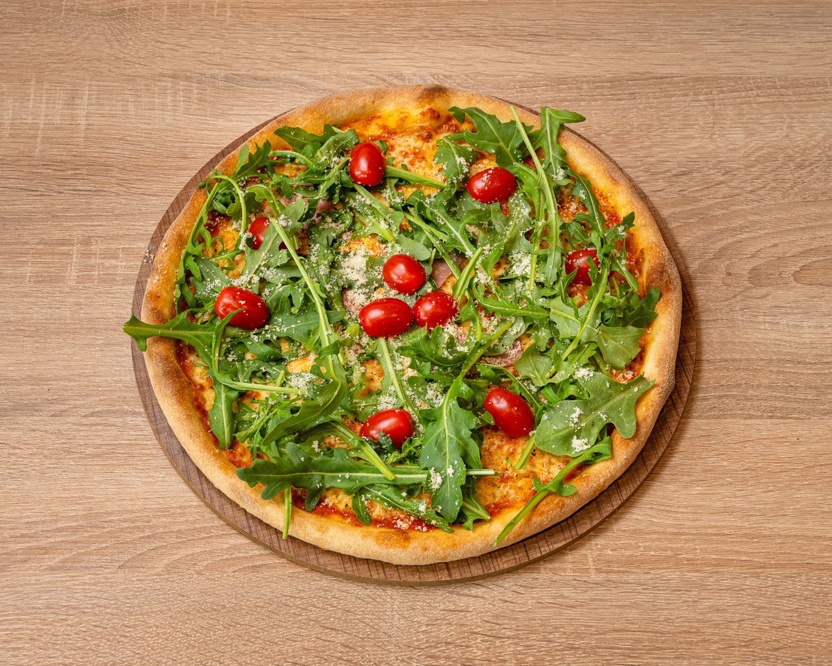 mit Putenschinken, Cherrytomaten, Rucola und Parmesankäse