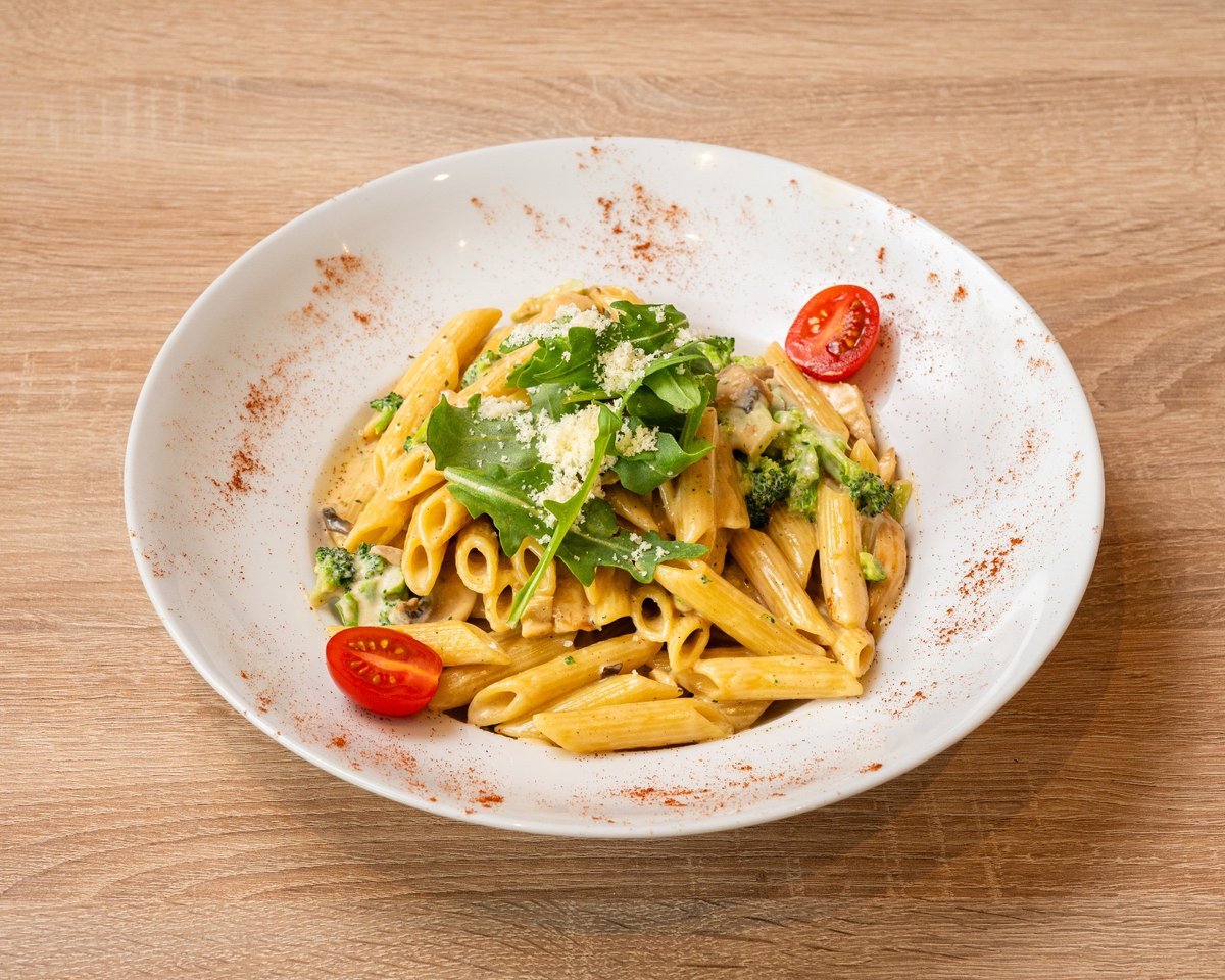 mit Sahnesoße, Brokkoli, Hähnchenfleisch und Champignons