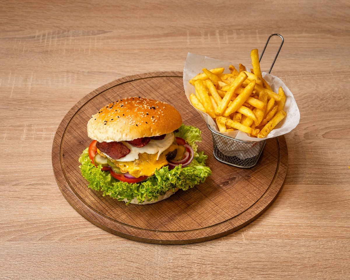 1x Mamas Liebling Burger 1x Pommes frites 1x alkoholfreies Getränk 0,33 l deiner Wahl