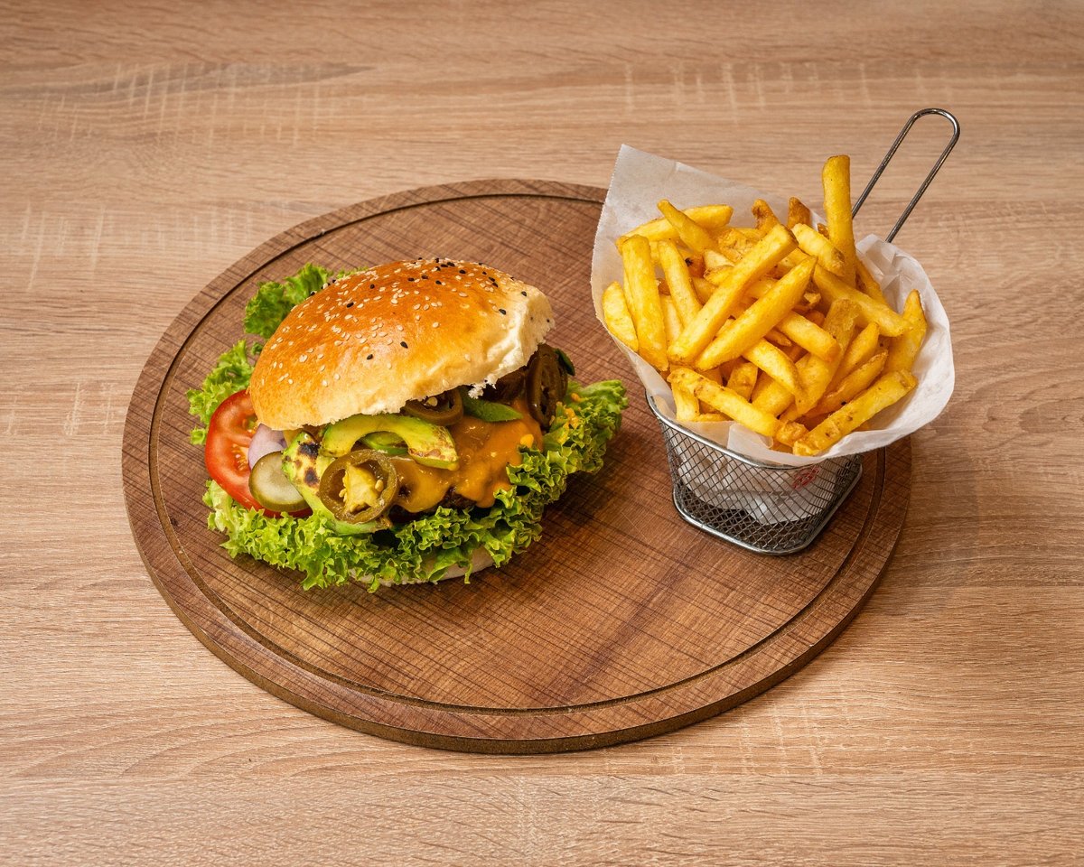 1x Gemüse Burger 1x Pommes frites 1x alkoholfreies Getränk 0,33 l deiner Wahl