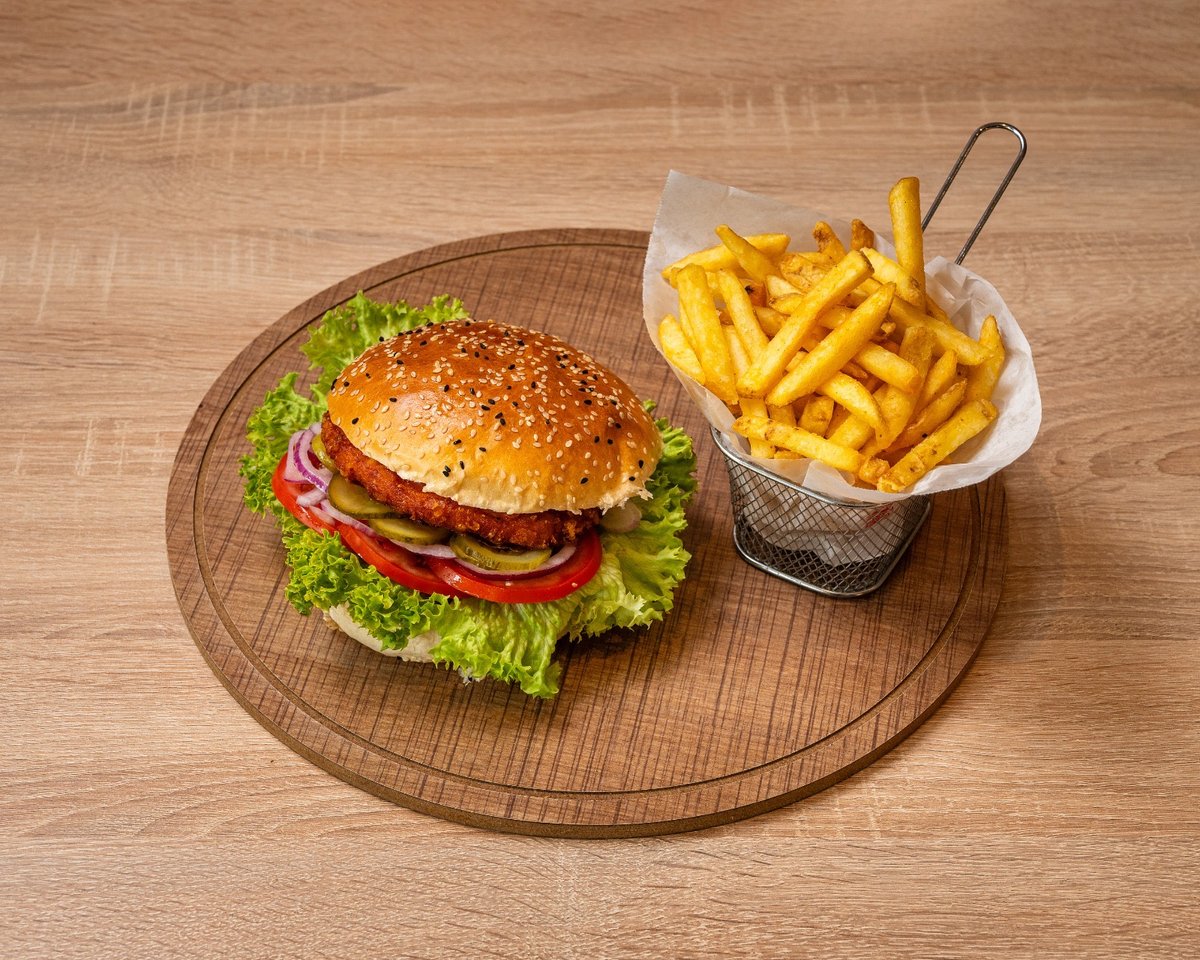 1x Crispy Chickenburger 1x Pommes frites 1x alkoholfreies Getränk 0,33 l deiner Wahl