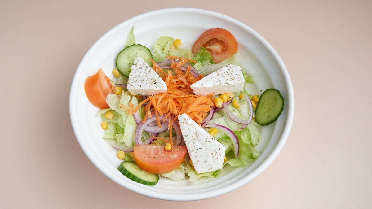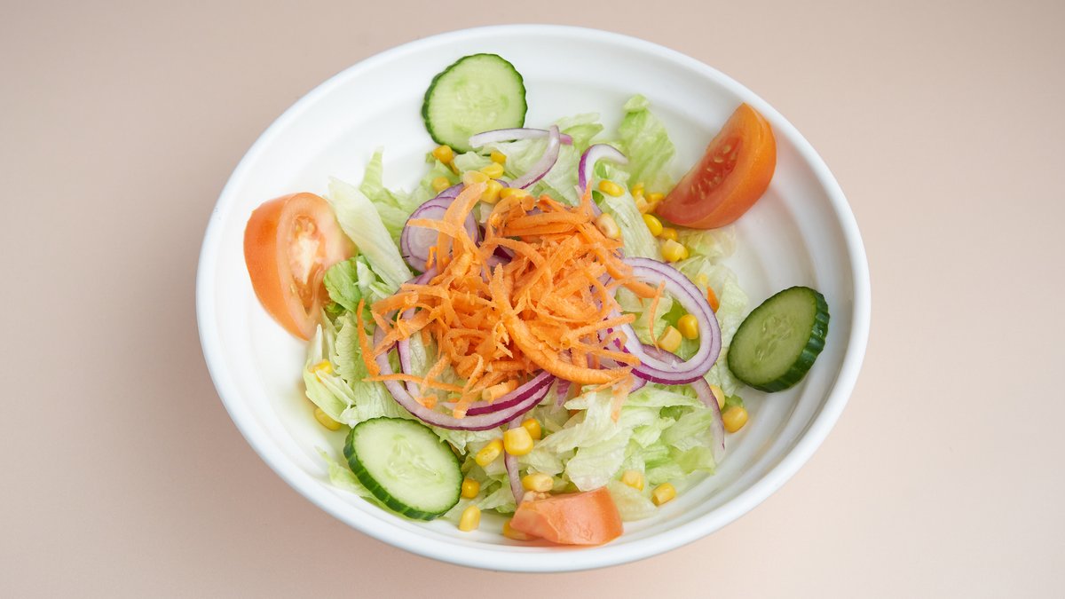 alle Salate werden mit Eisbergsalat, Tomaten, Gurken, Mais, Möhren, Zwiebeln und einem Dressing deiner Wahl zubereitet