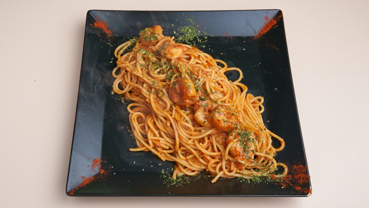 mit Scampi, Knoblauch, Tomaten und Tomatensoße