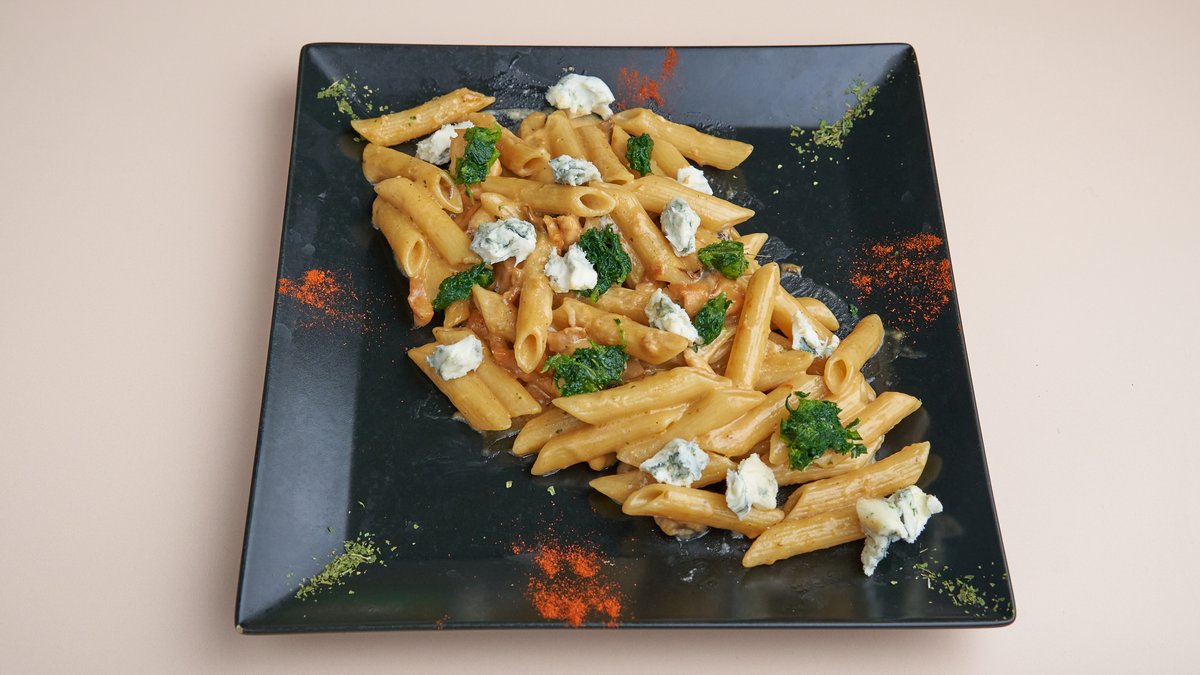 mit Champignons, Spinat, Gorgonzola-Sahnesoße und mit Käse überbacken