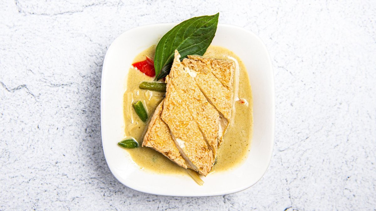 leicht scharf wahlweise knuspriges Hähnchen oder Tofu auf rotem Curry mit Kokosmilch, Auberginen, grünen Bohnen, Bambusstreifen und süßem Basilikum