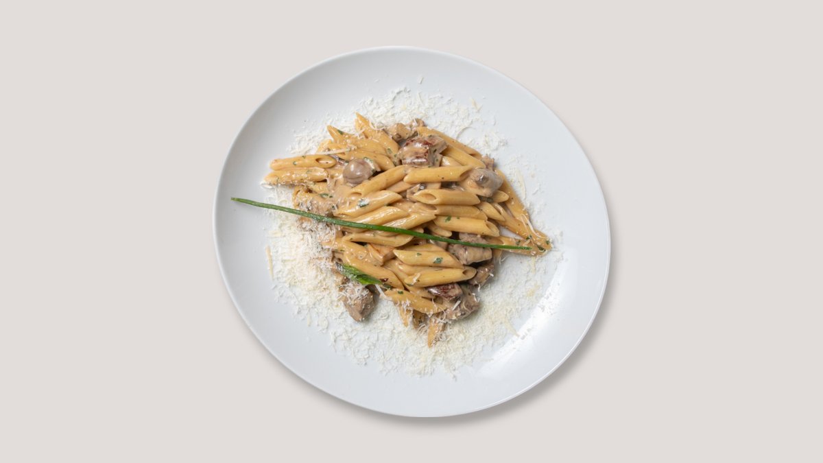 kurze Nudeln mit Rinderfiletspitzen in einer Champignon-Sahnesoße