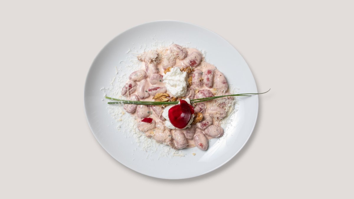 hausgemachte Rote-Beete-Kartoffelklößchen in einer Mascarpone-Sahnesoße mit Walnüssen