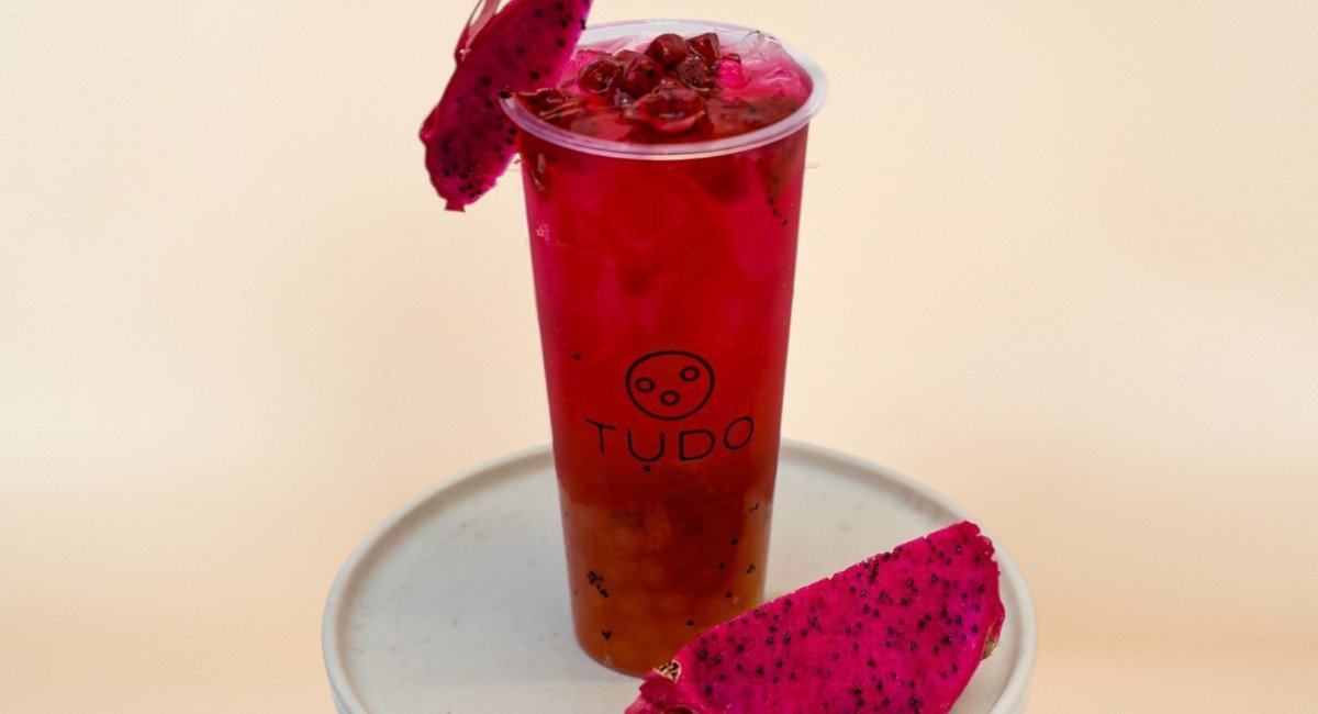 mit Taro Milk, Erdbeeren, Pink Dalgona und Red Berry Boba