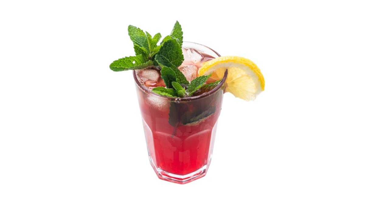 hausgemachter Mocktail mit Eiswürfeln, Limonade, Schwarzer Tee, 28 Black Acai, frischer Minze und Zitrone