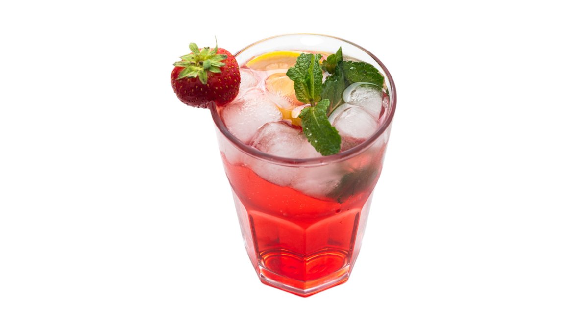 hausgemachter Mocktail mit Eiswürfeln, Limonade, Erdbeeren, Erdbeer-Sirup, frischer Minze und Sprudelwasser