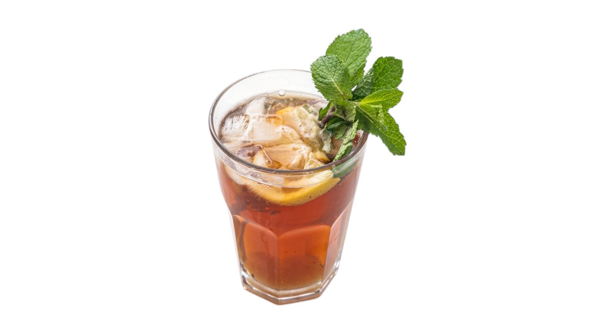 hausgemachter Eistee mit Eiswürfeln, Schwarzer Tee, frischer Minze, Zitrone und Zucker