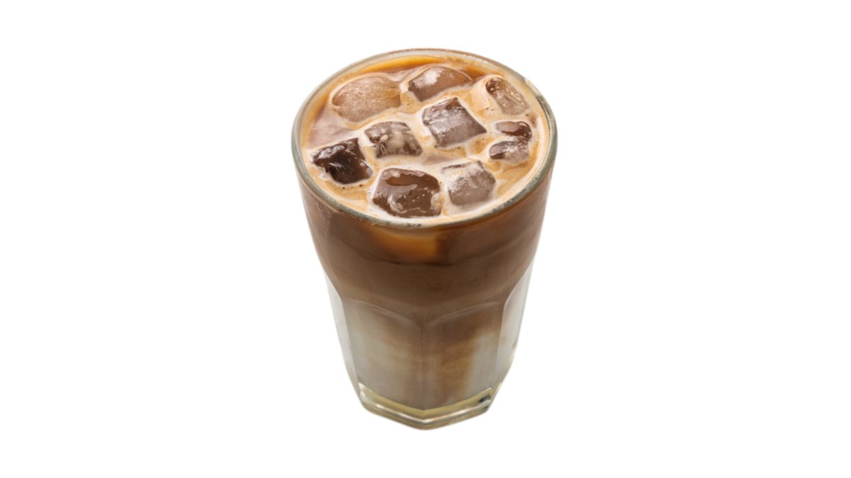 Iced Cortado mit Karamel, Kondensmilch, Eiswürfeln und Doppeltem Espresso
