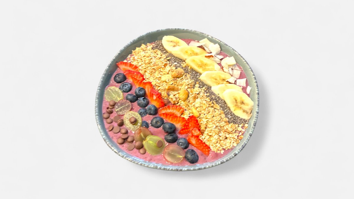 100% Acai, saisonale Früchte wie Banane, Apfel, Erdbeere, Traube, Heidelbeeren, Homemade Granola, Kokosflocken, Choc Drops