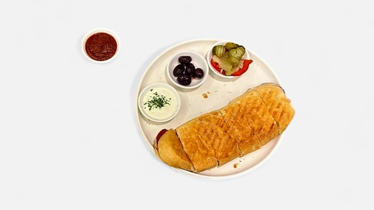 Käse Sucuk Toast im Turkish Big Bread mit schwarzen Oliven, Joghurt Dip und Tursu (eingelegtes Gemüse)