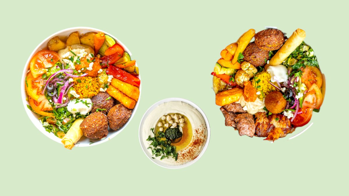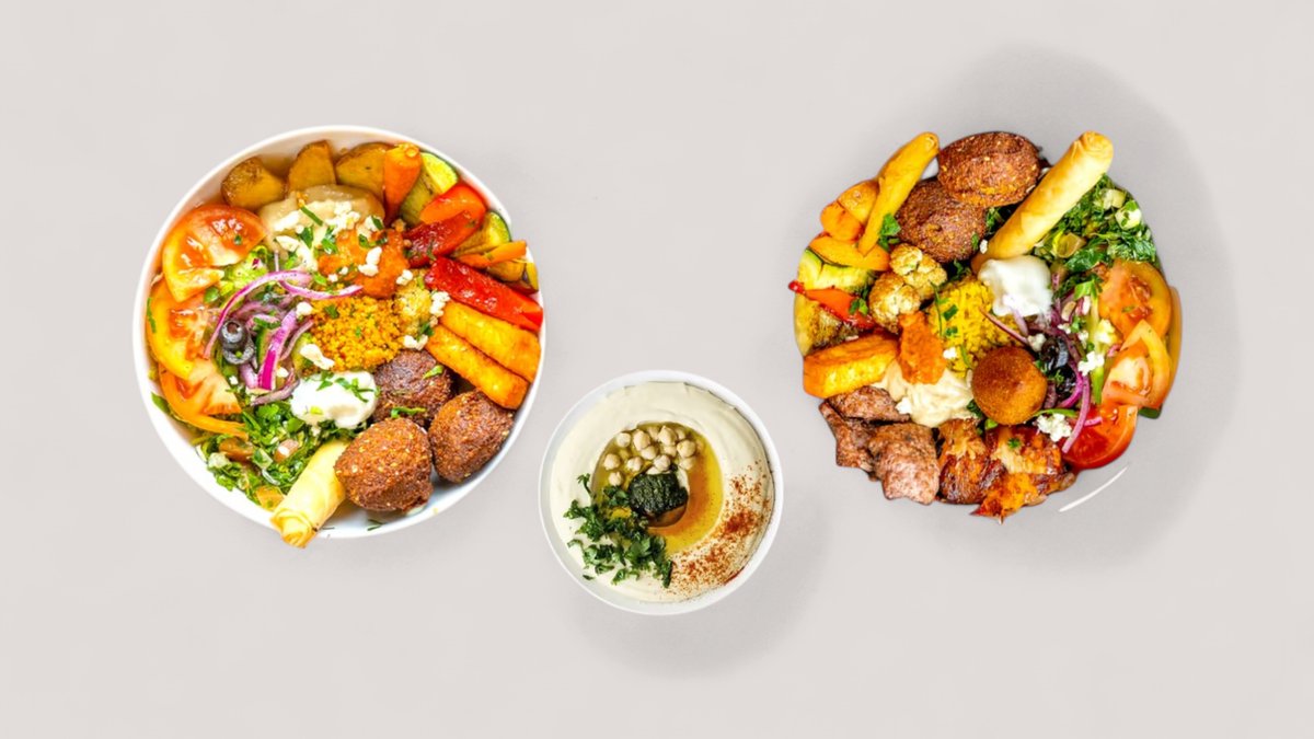Alle Bowls werden mit Taboulah, Couscous, Hummus, Salat, Soßen nach Wahl und Brot serviert