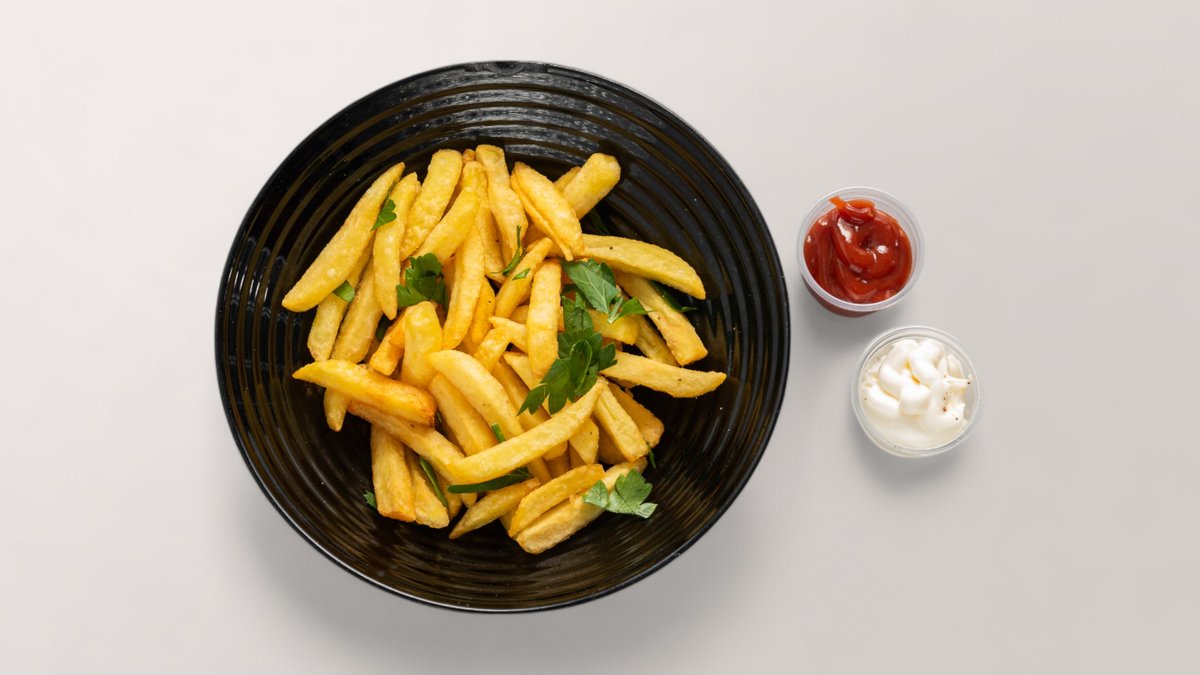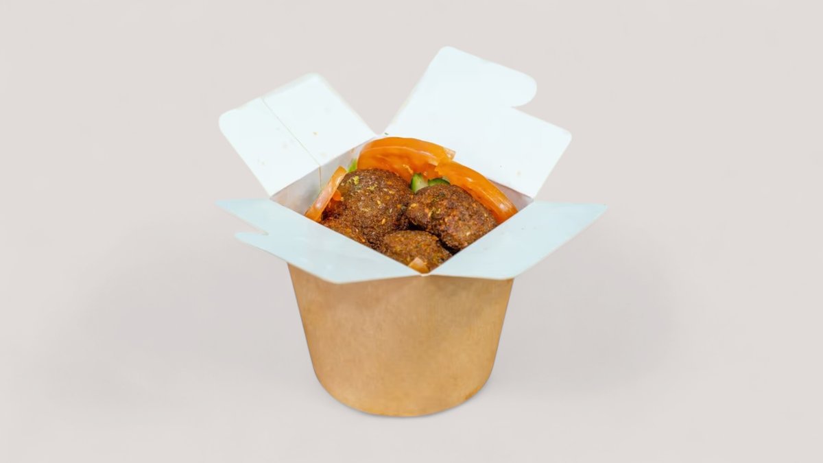 mit frittierten Kicherebsenbällchen, Käse, Salat und Homemade Pommes