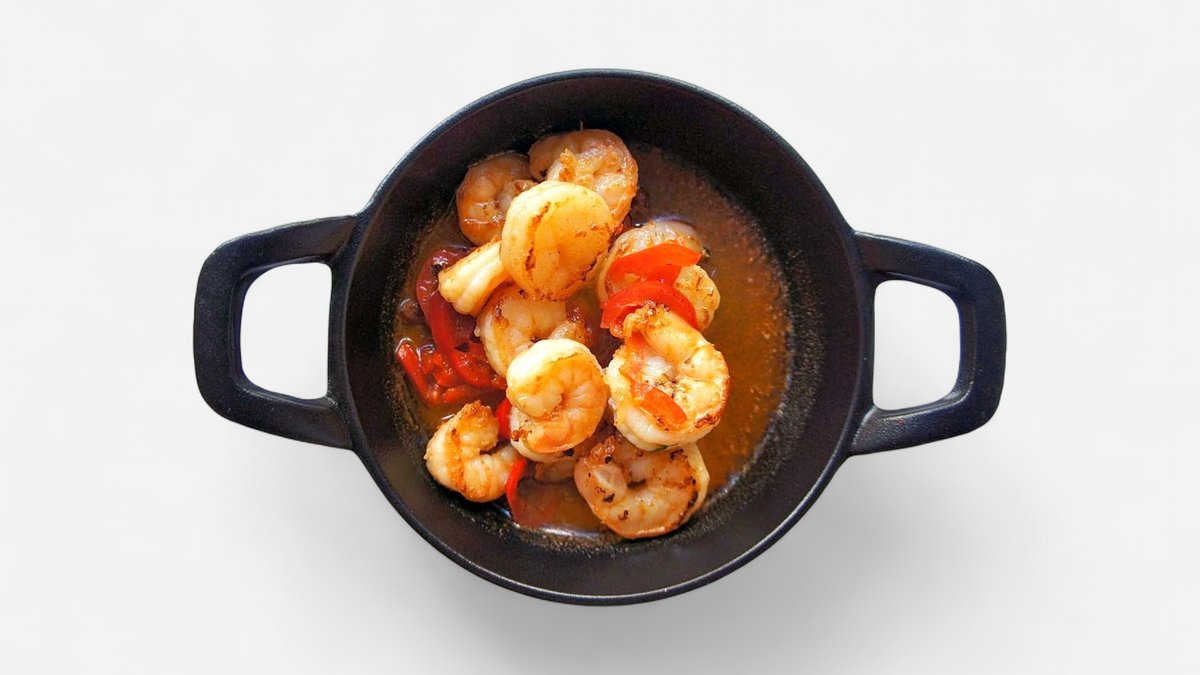 Garnelenpfanne mit Weißwein, Paprika, Knoblauch und Butter Enthält Alkohol, für Kinder und schwangere Frauen nicht geeignet